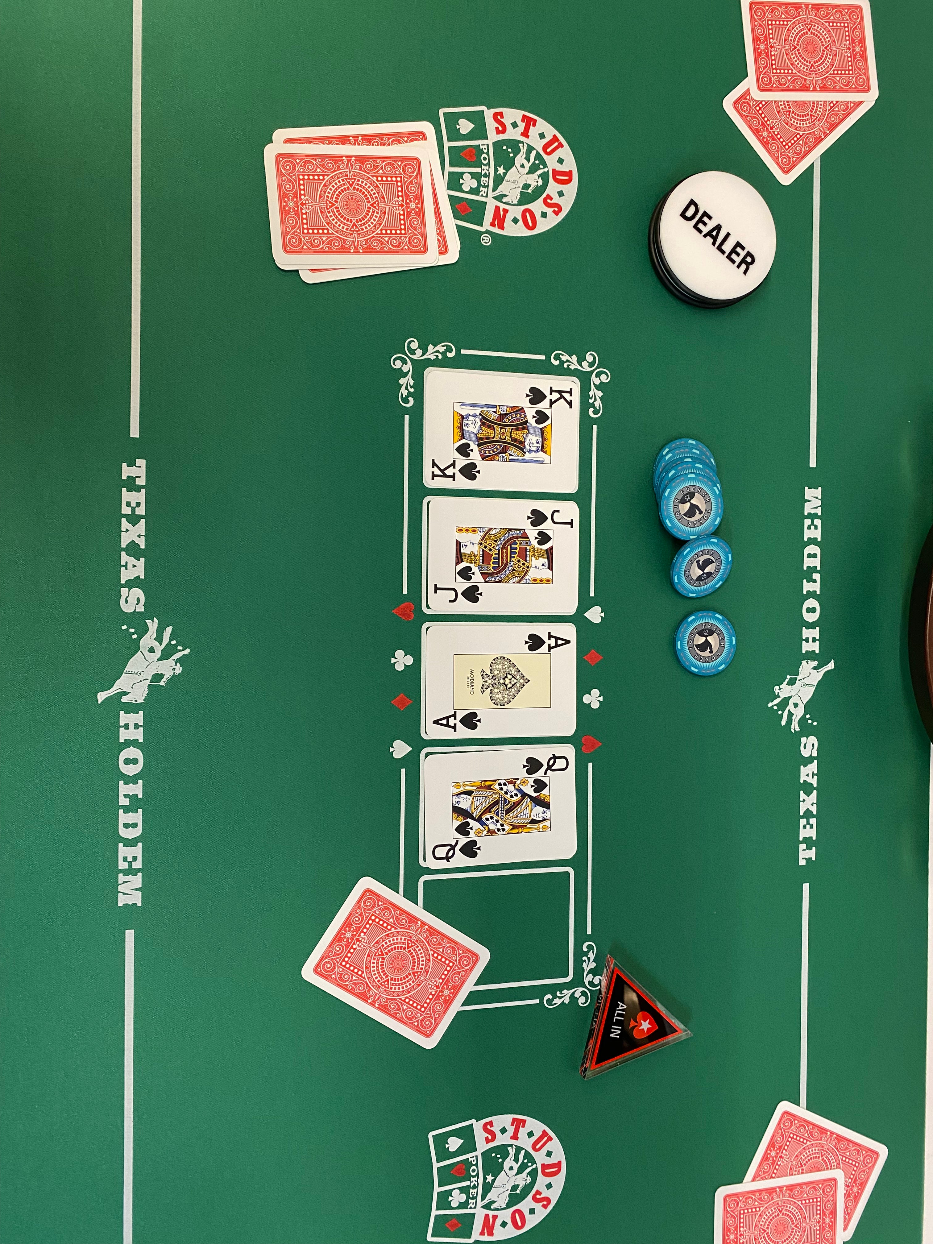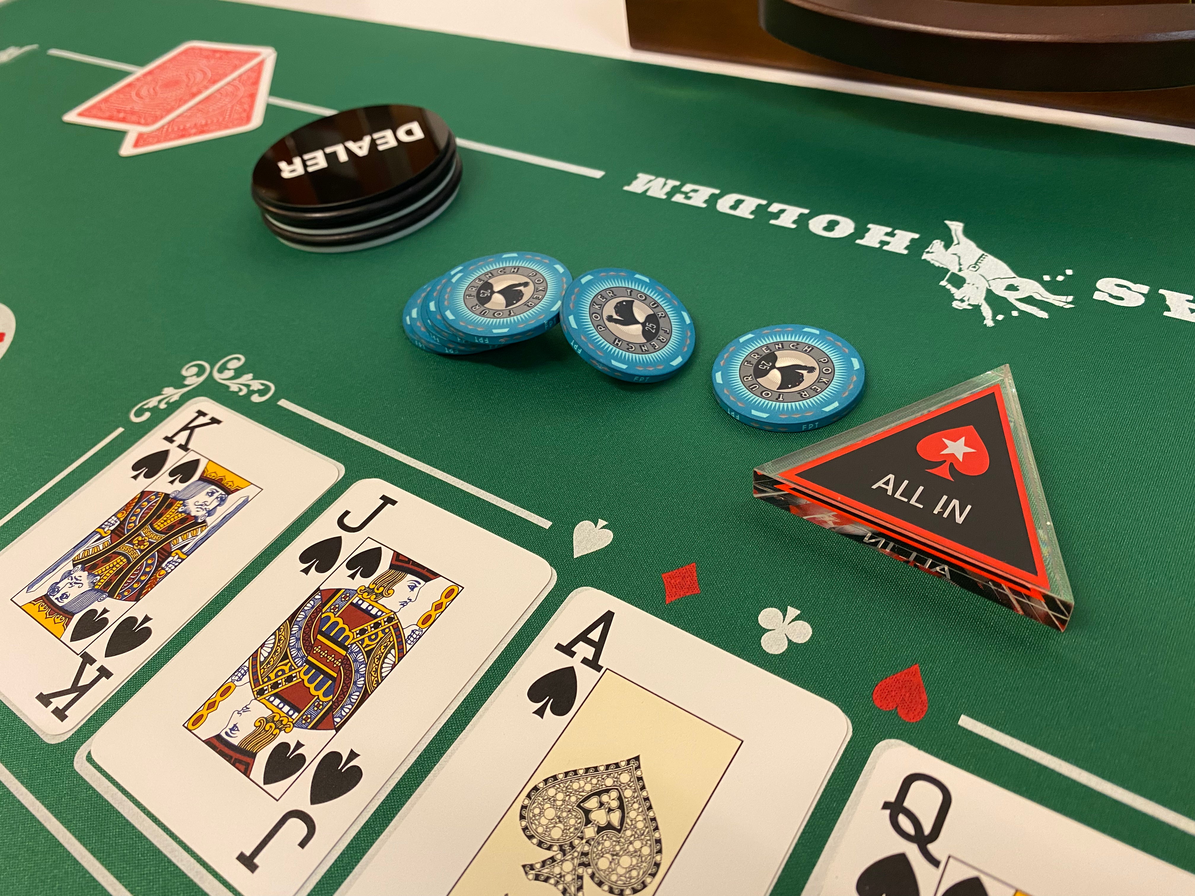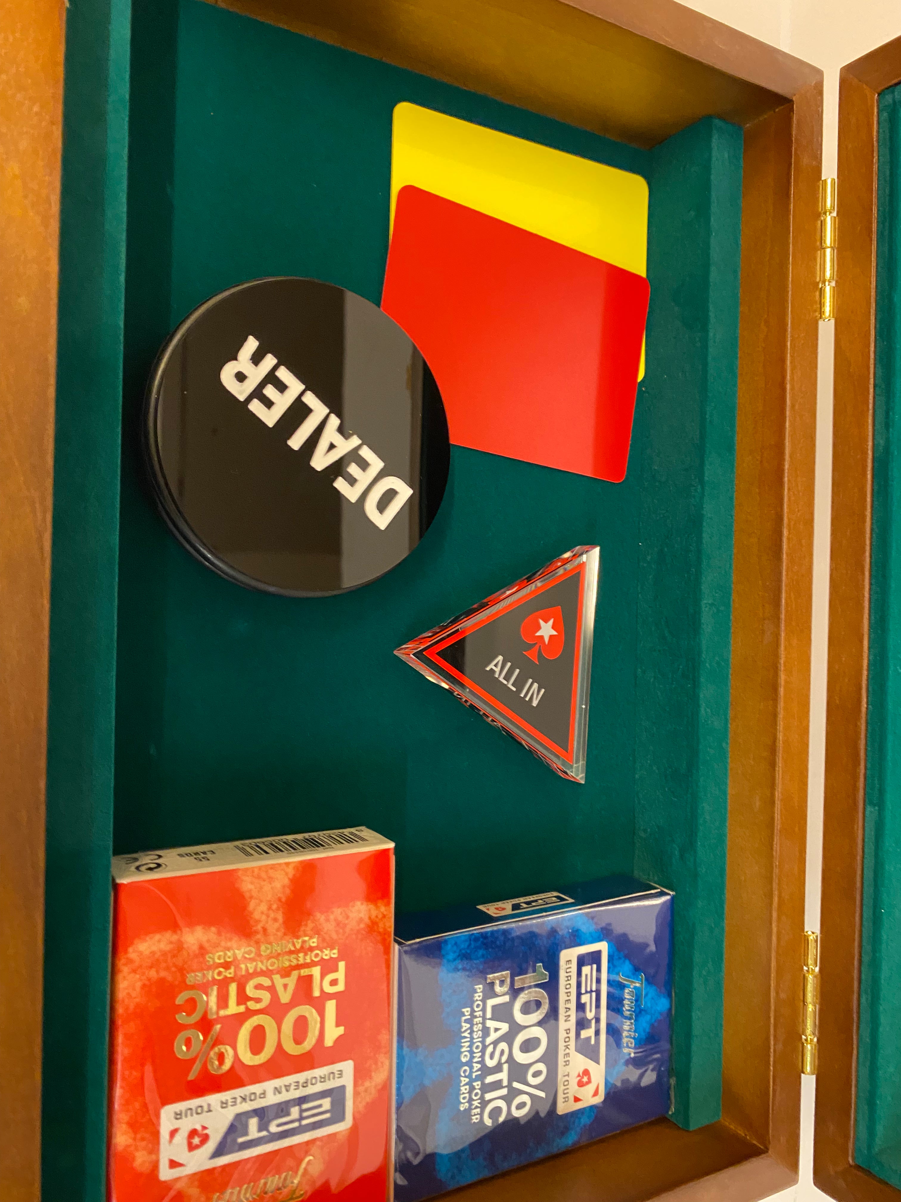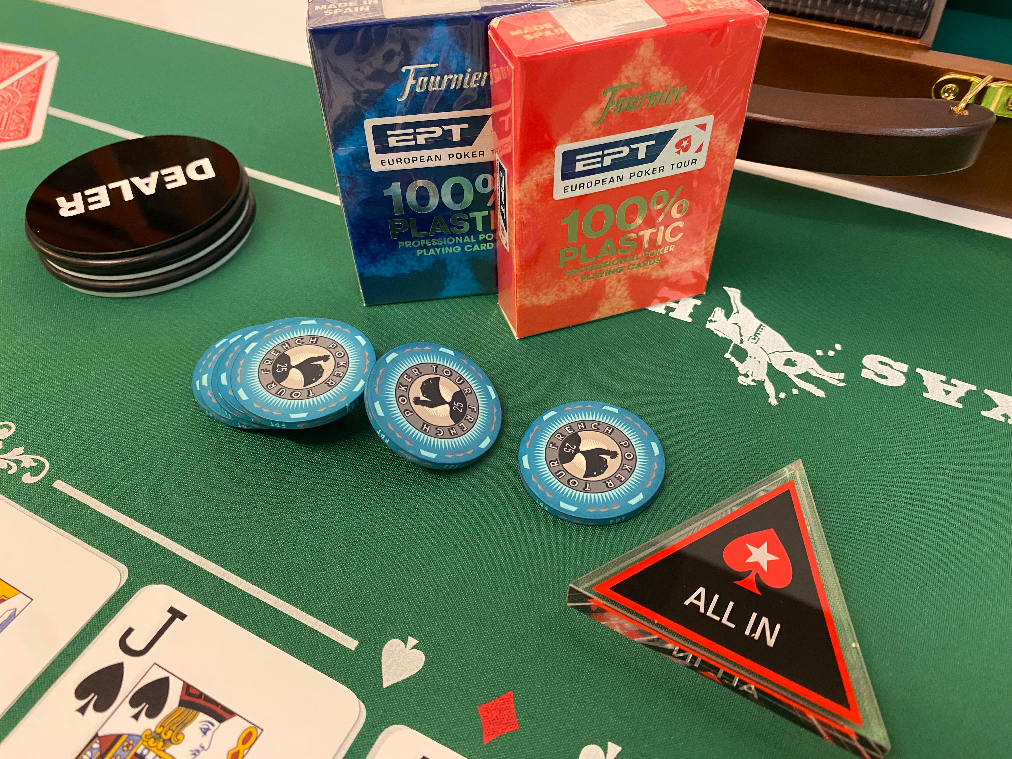 Mallette se composant d'un gros bouton dealer reversible (77 mm de diamètre) et de 2 jeux de cartes Fournier EPT, un bouton all in triangle transparent et 2 cartes de coupe.