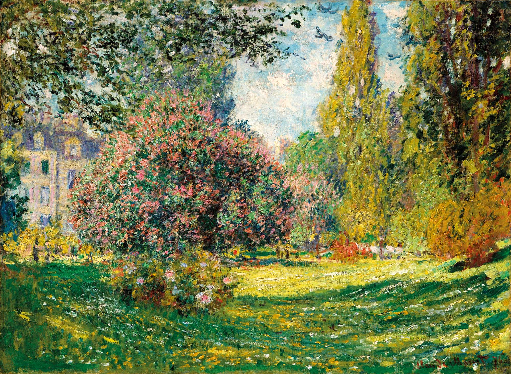 Claude Monet peint six tableaux représentant le parc Monceau, dont cette perspective datée de 1876. Situé dans le 8ème arrondissement de Paris, le parc est aménagé à la fin du 18e siècle. Lartiste réalise trois vues du parc au printemps 1876. Celle-ci, présentée à lexposition impressionniste de 1877, met laccent sur les étendues dherbe verte et les arbres en fleurs.